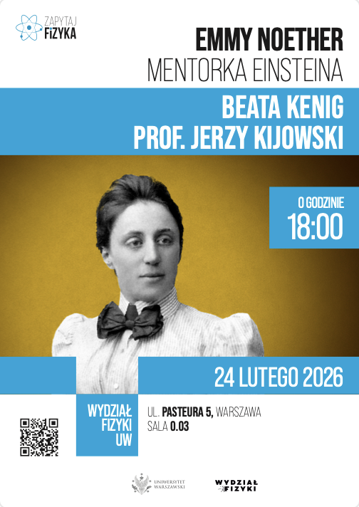 Niniejsze spotkanie nie jest tradycyjnym wykładem, lecz rozmową Beaty Kenig – tłumaczki książki „Emmy Noether – mentorka Einsteina” – z prof. Jerzy Kijowskim – w szczególności znawcą naukowych osiągnięć Emmy Noether.
